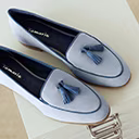 Mocassins bleu clair à pampilles et ballerines roses avec nœud dans une armoire de bureau.